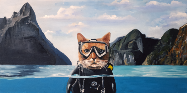 El gato buceador Óleo sobre madera, 30 x 60 cm. 2023