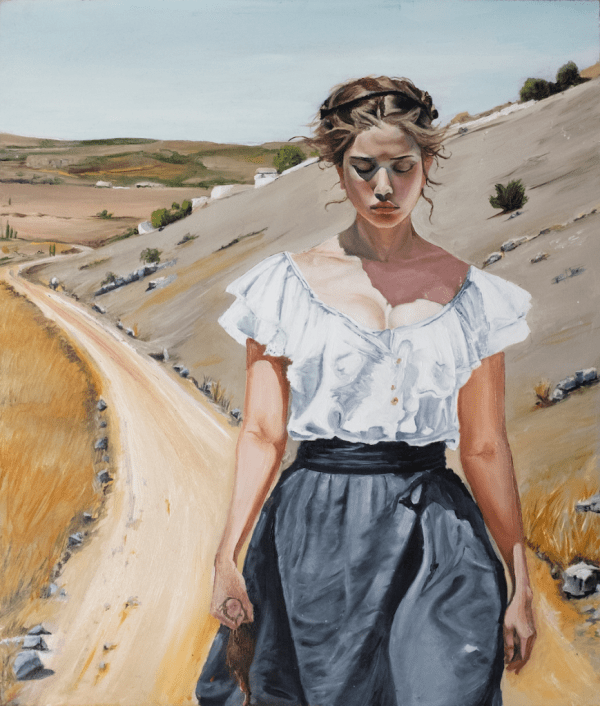 Óleo sobre madera 50×50 ESTA ES LA HISTORIA. Betania nació el 15 de octubre de 1900 en un pequeño pueblo de Sicilia, Italia. Su madre murió siendo ella aún muy pequeña en el parto de su tercer hijo. Con un hermano acabado de nacer, dos hermanos mayores y su padre amargado, tirano y borracho, Betania tuvo que lidiar con repetidos abusos sexuales, aparte de ocuparse de la casa, la intendencia y su hermano pequeño. Betania, una de las mujeres más hermosas que jamás creó la naturaleza, era desgraciada, quería huir, y repetidas veces miraba el acantilado como única salida. . Aquel día su padre regresó antes de tiempo, en sus ojos bañados de alcohol se podían leer sus intenciones. No culminó, se quedó dormido encima bajo los efectos etílicos. Betania se liberó como pudo de los 90 kilos de cerdo, y sin pensar le cortó el pene. Aquella noche para cenar se sirvió sopa de pene, ajos y algún que otro trozo de carne macerada en alcohol. Buen provecho.